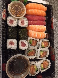 The menu online is divided into different sections by types of sushi eg nigiri (oval shaped rice with a topping), maki roll (roll of rice wrapped in seaweed with a filling) and so on. There was just so much that I didn’t know what to choose, but luckily YouMeSushi is prepared for that and can make life easier by offering selection boxes and platters, from the low-fat ‘detox box’ (£7.95) containing 9 pieces, to the £12 deluxe box, with 14 pieces of four different types, to the 130-piece party box for £99. We ordered the 18-piece YouMe Nigiri box, containing two salmon nigiri, two tuna nigiri, two prawn nigiri, six salmon and avocado uramaki rolls and six tuna maki rolls. These were really good though I think the pieces of tuna could have been a little thicker.