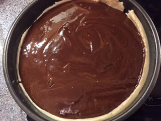 Whisk the eggs into the dark chocolate, then pour into the pastry case. Add blobs of the milk chocolate mixture to the tin, then swirl gently to achieve a marbled effect [I found this quite difficult and ended up just pouring most of the milk chocolate on top of the dark chocolate].